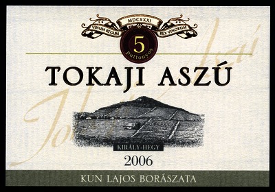 2006-os 5 puttonyos tokaji aszú boroscímke Kun Lajos Borászatától