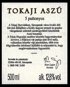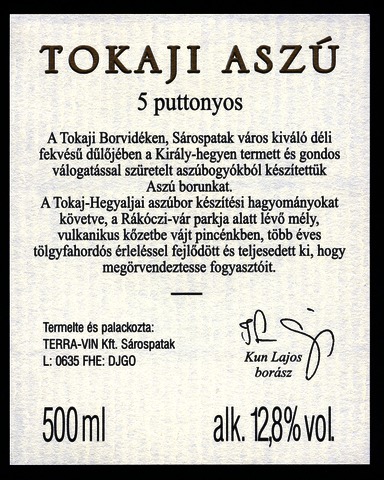Bortípus: aszú; Termelő neve: TERRA VIN Kft.; Termelő címe: Sárospatak; Évjárat: 2006; színes címke