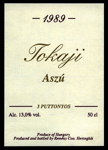 Bortípus: aszú; Termelő neve: Remény Coo.; Termelő címe: Hercegkút; Évjárat: 1989; színes címke