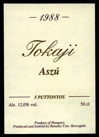 Bortípus: aszú; Termelő neve: Remény Coo.; Termelő címe: Hercegkút; Évjárat: 1988; színes címke