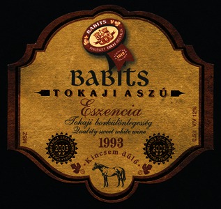 Bortípus: aszú eszencia; Termelő neve: Babits Pincészet Kft.; Termelő címe: Tolcsva; Évjárat: 1993; színes címke