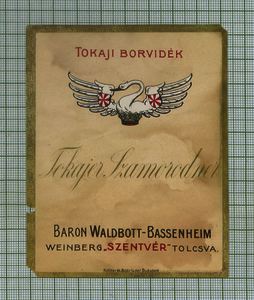 Bortípus: szamorodni; Termelő neve: Waldbott-Bassenheim Frigyes; Termelő címe: Tolcsva; Évjárat: 1910-es évek; színes címke
