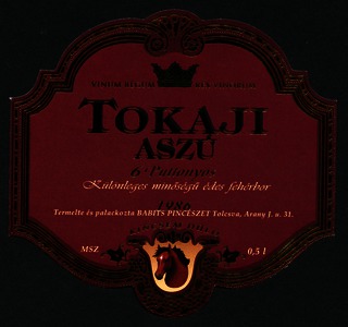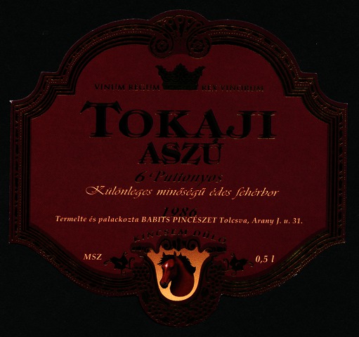 Bortípus: aszú; Termelő neve: Babits Pincészet; Termelő címe: Tolcsva, Arany J. u. 31.; Évjárat: 1986; színes címke
