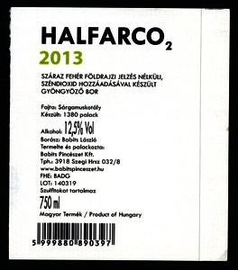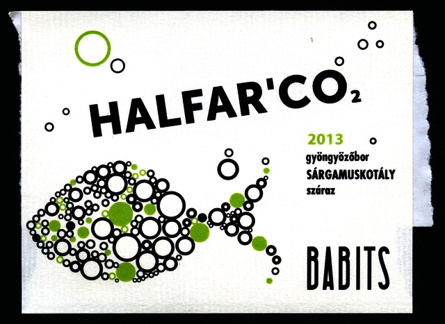 Bortípus: sárga muskotály; Termelő neve: Babits Pincészet Kft.; Termelő címe: 3918 Szegi Hrsz 032/8; Évjárat: 2013; színes címke