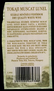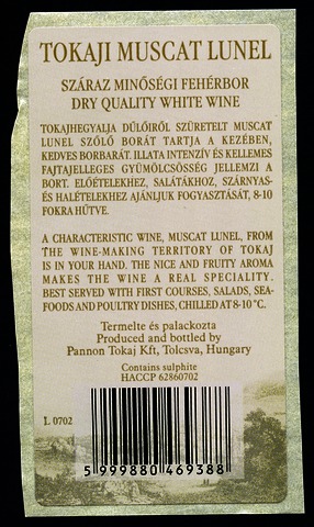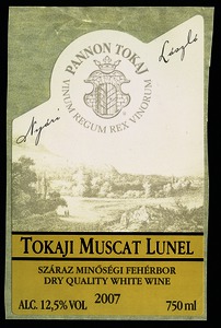 Bortípus: muscat lunel; Termelő neve: Pannon Tokaj Kft.; Termelő címe: 3934 Tolcsva; Évjárat: 2007; színes címke