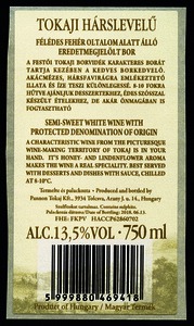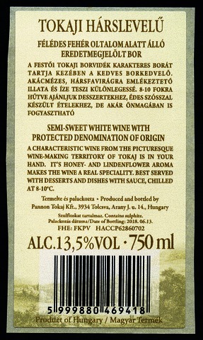 Bortípus: hárslevelű; Termelő neve: Pannon Tokaj Kft.; Termelő címe: 3934 Tolcsva, Arany J. u. 14.; Évjárat: 2017; színes címke