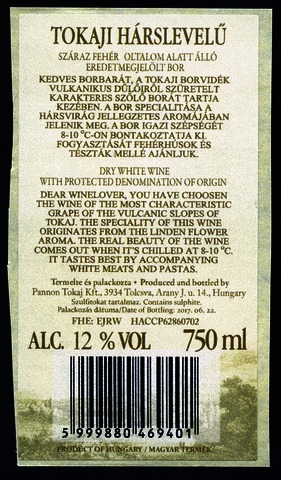 Bortípus: muscat lunel; Termelő neve: Pannon Tokaj Kft.; Termelő címe: 3934 Tolcsva, Arany J. u. 14.; Évjárat: 2016; színes címke