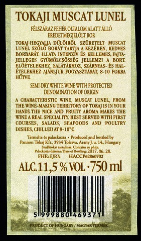 Bortípus: muscat lunel; Termelő neve: Pannon Tokaj Kft.; Termelő címe: 3934 Tolcsva, Arany J. u. 14.; Évjárat: 2016; színes címke