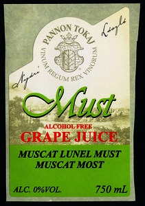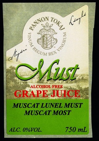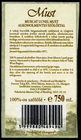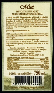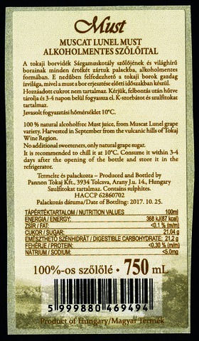 Bortípus: muscat lunel must; Termelő neve: Pannon Tokaj Kft.; Termelő címe: 3934 Tolcsva, Arany J. u. 14.; Évjárat: 2017; színes címke