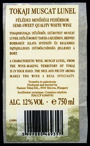 Bortípus: muscat lunel; Termelő neve: Pannon Tokaj Kft.; Termelő címe: 3934 Tolcsva; Évjárat: 2008; színes címke