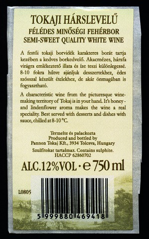 Bortípus: hárslevelű Termelő neve: Pannon Tokaj Kft.; Termelő címe: Tolcsva; Évjárat: 2008; színes címke