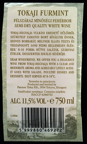 Bortípus: furmint; Termelő neve: Pannon Tokaj; Termelő címe: Tolcsva; Évjárat: 2008; színes címke