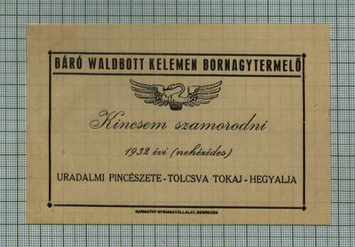 Bihari, Sándor (Digitalizáló): Báró Waldbott Kelemen Nagybortemelő Kincsem szamorodni 1932. évi (nehézédes) Uradalmi Pincészere - Tolcsva Tokaj-Hegyalja Harmathy Nyomdavállalat, Debrecen. (Publikálatlan) (2023)
