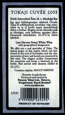 Bortípus: cuvée; Termelő neve: Pannon Tokaj Kft.; Termelő címe: Tolcsva; Évjárat: 2005; színes címke