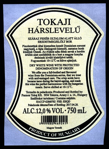 Bortípus: hárslevelű; Termelő neve: Pannon Tokaj Kft.; Termelő címe: 3934 Tolcsva, Arany J. u. 14.; Évjárat: 2016; színes címke