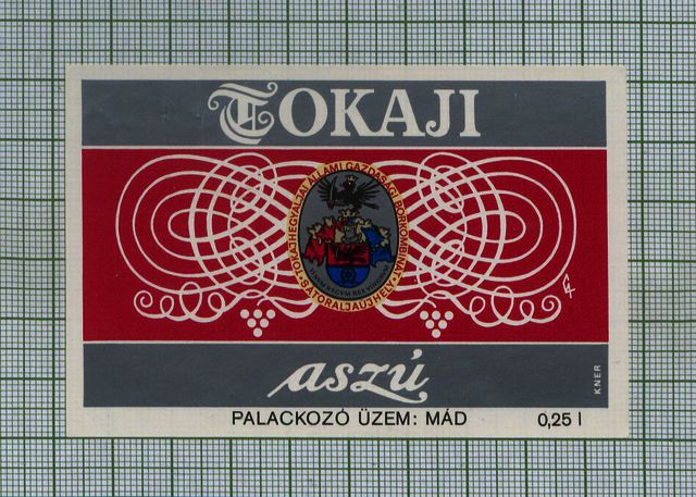 Bortípus: asszú; Termelő neve: Tokajhegyaljai Állami Gazdasági Borkombinát; Termelő címe: Sátoraljaújhely, Mártírok útja 17.; Évjárat: 1971 és 1974 között; színes címke