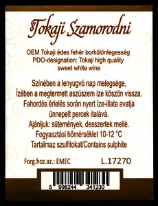 Bortípus: szamorodni; Termelő neve: Tolcsva-Bor Kft.; Termelő címe: 3934 Tolcsva, Táncsics M. u. 3.; Évjárat: 2014; színes címke