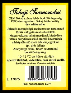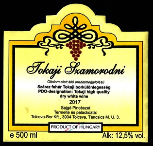 Bortípus: szamorodni; Termelő neve: Tolcsva-Bor Kft.; Termelő címe: 3934 Tolcsva, Táncsics M. út 3.; Évjárat: 2017; színes címke