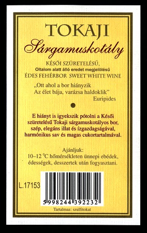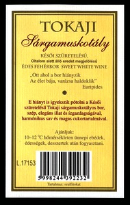 Bortípus: sárga muskotály; Termelő neve: Tolcsva Bor Kft.; Termelő címe: Tolcsva, Táncsics M. u. 3.; Évjárat: 2016; színes címke