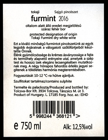 Bortípus: furmint; Termelő neve: Tolcsva-Bor Kft.; Termelő címe: 3934 Tolcsva, Táncsics M. út 3.; Évjárat: 2016; színes címke