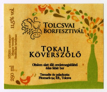 Bortípus: kövérszőlő; Termelő neve: Fitomark ‘94 Kft.; Termelő címe: Tolcsva; színes címke