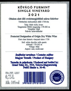 Bortípus: furmint; Termelő neve: Grand Tokaj Zrt.; Termelő címe: 3934 Tolcsva, Petőfi S. u. 36-40.; Évjárat: 2021; színes címke