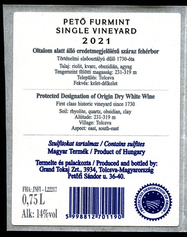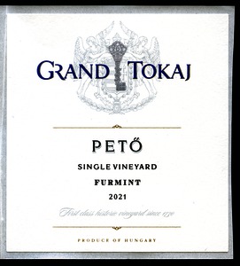 Bortípus: furmint; Termelő neve: Grand Tokaj Zrt.; Termelő címe: 3934 Tolcsva, Petőfi S. u. 36-40.; Évjárat: 2021; színes címke