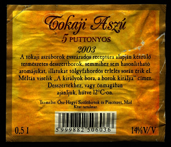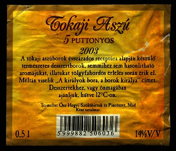 Bortípus: aszú; Termelő neve: Ősz-Hegyi Szőlőbirtok és Pincészet; Termelő címe: Mád; Évjárat: 2003; színes címke