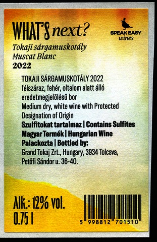 Bortípus: sárga muskotály; Termelő neve: Grand Tokaj Zrt.; Termelő címe: 3934 Tolcsva, Petőfi S. u. 36-40.; Évjárat: 2022; színes címke