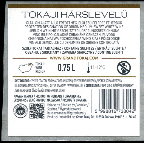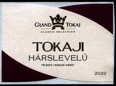 Bortípus: hárslevleű; Termelő neve: Grand Tokaj Zrt.; Termelő címe: 3934 Tolcsva, Petőfi S. u. 36-40.; Évjárat: 2022; színes címke