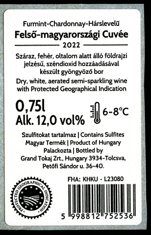 Bortípus: gyöngyözőbor, cuvée; Termelő neve: Grand Tokaj Zrt.; Termelő címe: 3934 Tolcsva, Petőfi S. u. 36-40.; Évjárat: 2022; színes címke