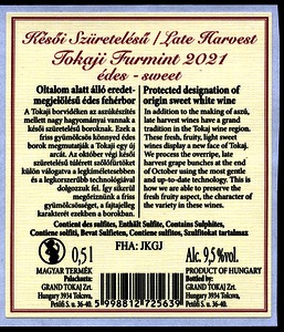 Bortípus: furmint; Termelő neve: Grand Tokaj Zrt.; Termelő címe: 3934 Tolcsva, Petőfi S. u. 36-40.; Évjárat: 2021; színes címke