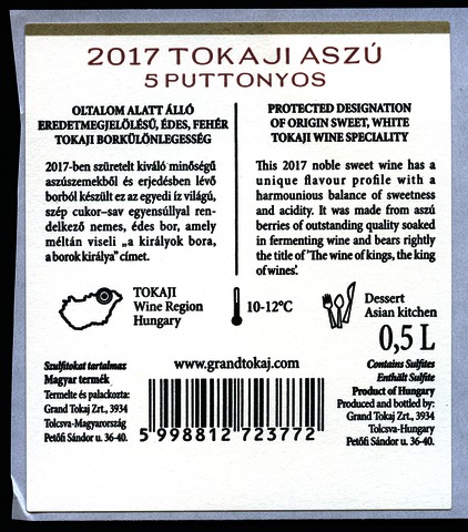 Bortípus: aszú; Termelő neve: Grand Tokaj Zrt.; Termelő címe: 3934 Tolcsva, Petőfi S. u. 36-40.; Évjárat: 2017; színes címke