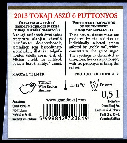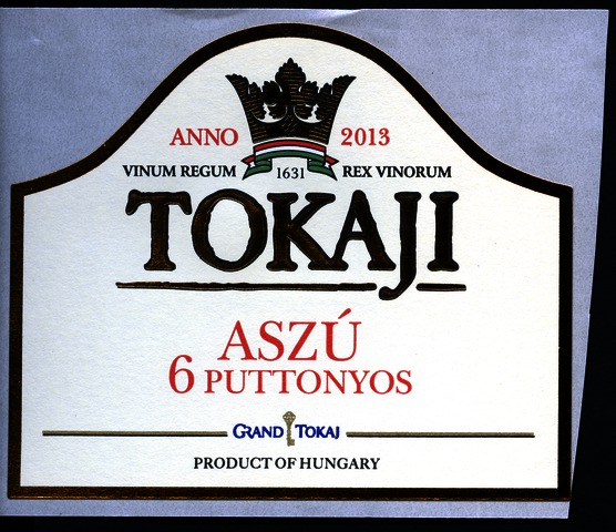 Bortípus: aszú; Termelő neve: Grand Tokaj Zrt.; Termelő címe: 3934 Tolcsva, Petőfi S. u. 36-40.; Évjárat: 2013; színes címke