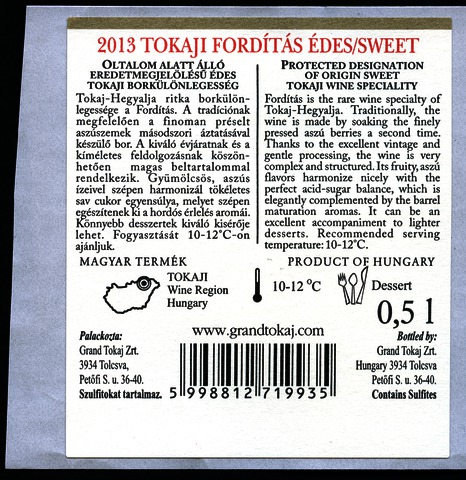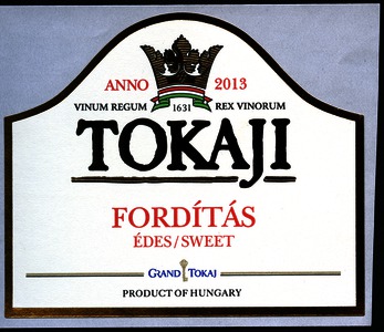 Bortípus: fordítás; Termelő neve: Grand Tokaj Zrt.; Termelő címe: 3934 Tolcsva, Petőfi S. u. 36-40.; Évjárat: 2013; színes címke