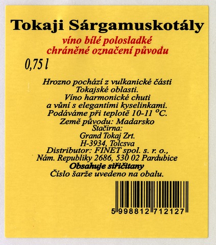 Bortípus: sárga muskotály; Termelő neve: Grand Tokaj Zrt.; Termelő címe: 3934 Tolcsva; színes címke