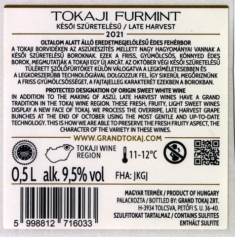 Bortípus: furmint; Termelő neve: Grand Tokaj Zrt.; Termelő címe: 3934 Tolcsva, Petőfi S. u. 36-40.; Évjárat: 2021; színes címke