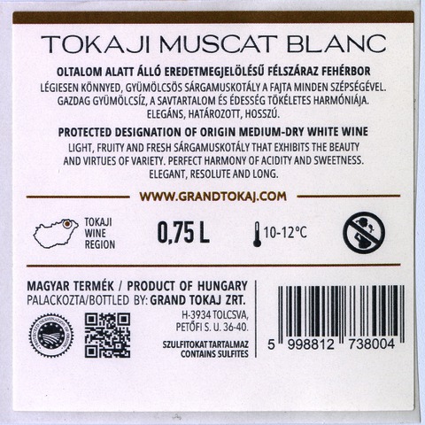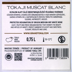 Bortípus: sárga muskotály; Termelő neve: Grand Tokaj Zrt.; Termelő címe: 3934 Tolcsva, Petőfi S. u. 36-40.; Évjárat: 2022; színes címke