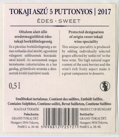 Bortípus: aszú; Termelő neve: Grand Tokaj Zrt.; Termelő címe: 3934 Tolcsva, Petőfi S. u. 36-40.; Évjárat: 2017; színes címke