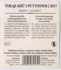 Kun, Zsanett (Digitalizáló): 2017-es 5 puttonyos tokaji aszú boroscímke a Grand Tokaj Zrt.-től. (Publikálatlan) (2024)