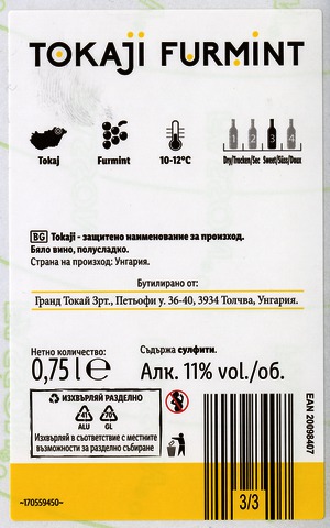 Bortípus: furmint; Termelő neve: Grand Tokaj Zrt.; Termelő címe: 3934 Tolcsva, Petőfi S. u. 36-40.; Évjárat: 2022; színes címke