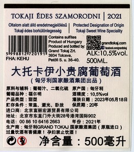 Bortípus: szamorodni; Termelő neve: Grand Tokaj Zrt.; Termelő címe: 3934 Tolcsva, Petőfi S. u. 36-40.; Évjárat: 2021; színes címke