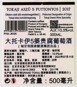 Bortípus: aszú; Termelő neve: Grand Tokaj Zrt.; Termelő címe: 3934 Tolcsva, Petőfi S. u. 36-40.; Évjárat: 2017; színes címke