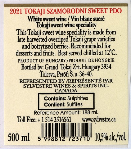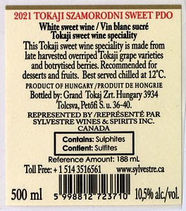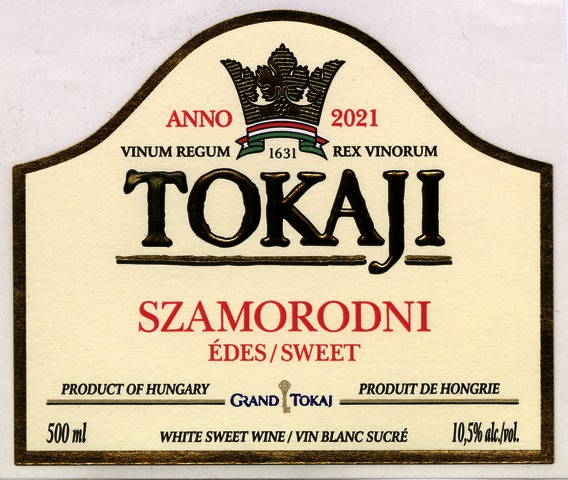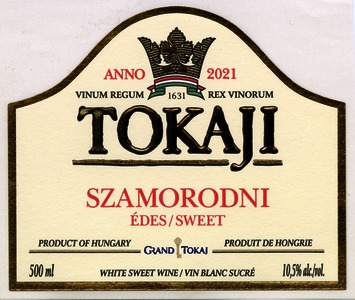 Bortípus: szamorodni; Termelő neve: Grand Tokaj Zrt.; Termelő címe: 3934 Tolcsva, Petőfi S. u. 36-40.; Évjárat: 2021; színes címke
