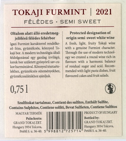 Bortípus: furmint; Termelő neve: Grand Tokaj Zrt.; Termelő címe: 3934 Tolcsva, Petőfi S. u. 36-40.; Évjárat: 2021; színes címke