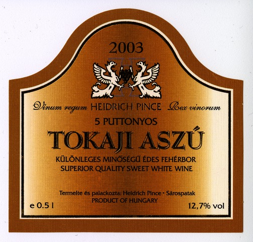 Bortípus: aszú; Termelő neve: Heidrich Pince; Termelő címe: Sárospatak; Évjárat: 2003; színes címke