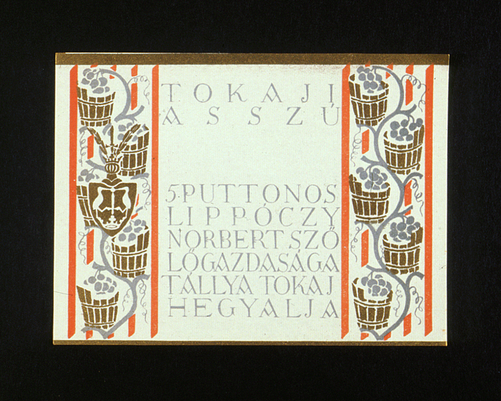 Bortípus: asszú; Termelő neve: Lippóczy Norbert; Termelő címe: Tállya; Évjárat: 1930-as évek; színes címke