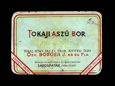 Bihari, Sándor (Digitalizáló): Tokaji Aszú Bor Tokaj-Hegy. Faj- és Óbor Kiviteli Társ Özv. Borger J. né és Fia Bornagykereskedők és Bortermelők Sárospatak (Tokaj melett) Eredeti töltés Original Filling 20-. (Publikálatlan) (2023)
