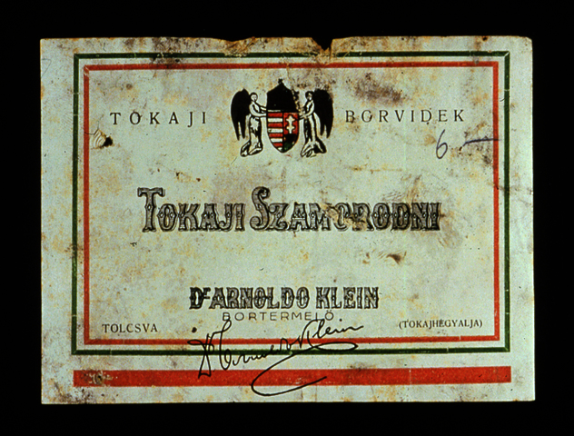 Bortípus: szamorodni; Termelő neve: Klein Arnold; Termelő címe: Tolcsva; Évjárat: 1920-as évek; színes címke;
