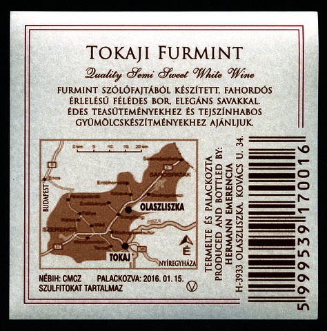 Bortípus: furmint; Termelő neve: Hermann Emerencia; Termelő címe: H-3933 Olaszliszka, Kovács u. 34.; színes címke